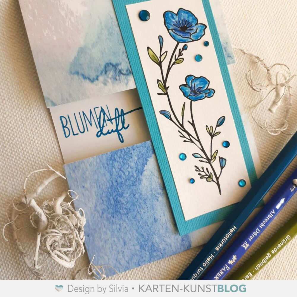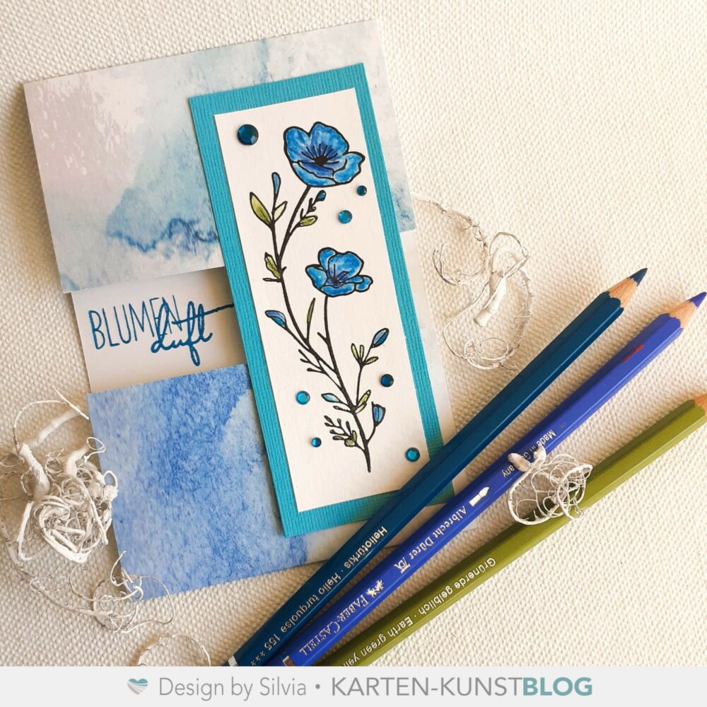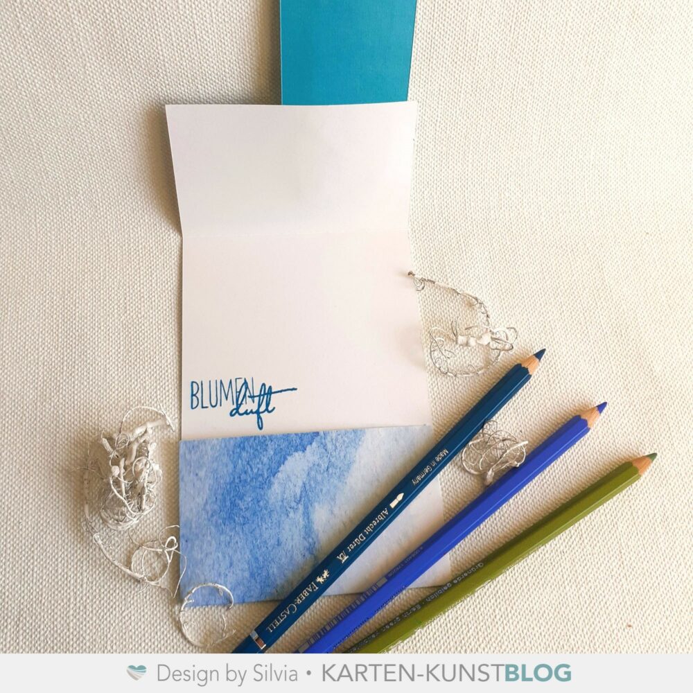 Dafür habe ich Blüten aus dem Stempelset „KK-0257 Delicate Plants“ mit Albrecht Dürer Stiften coloriert und auf einer besonderen Kartenform arrangiert.