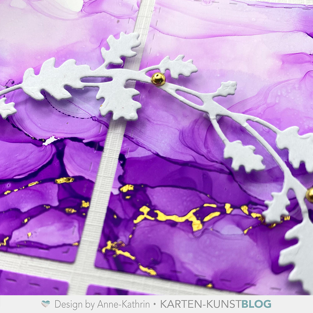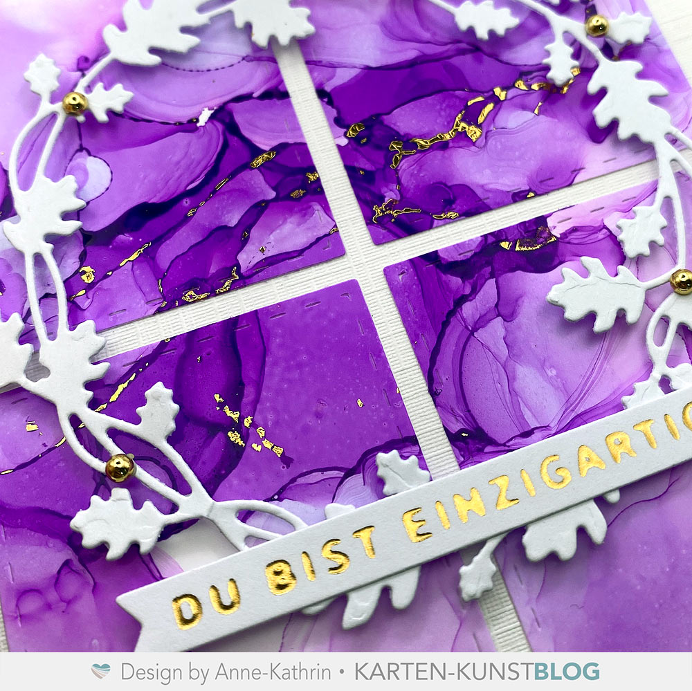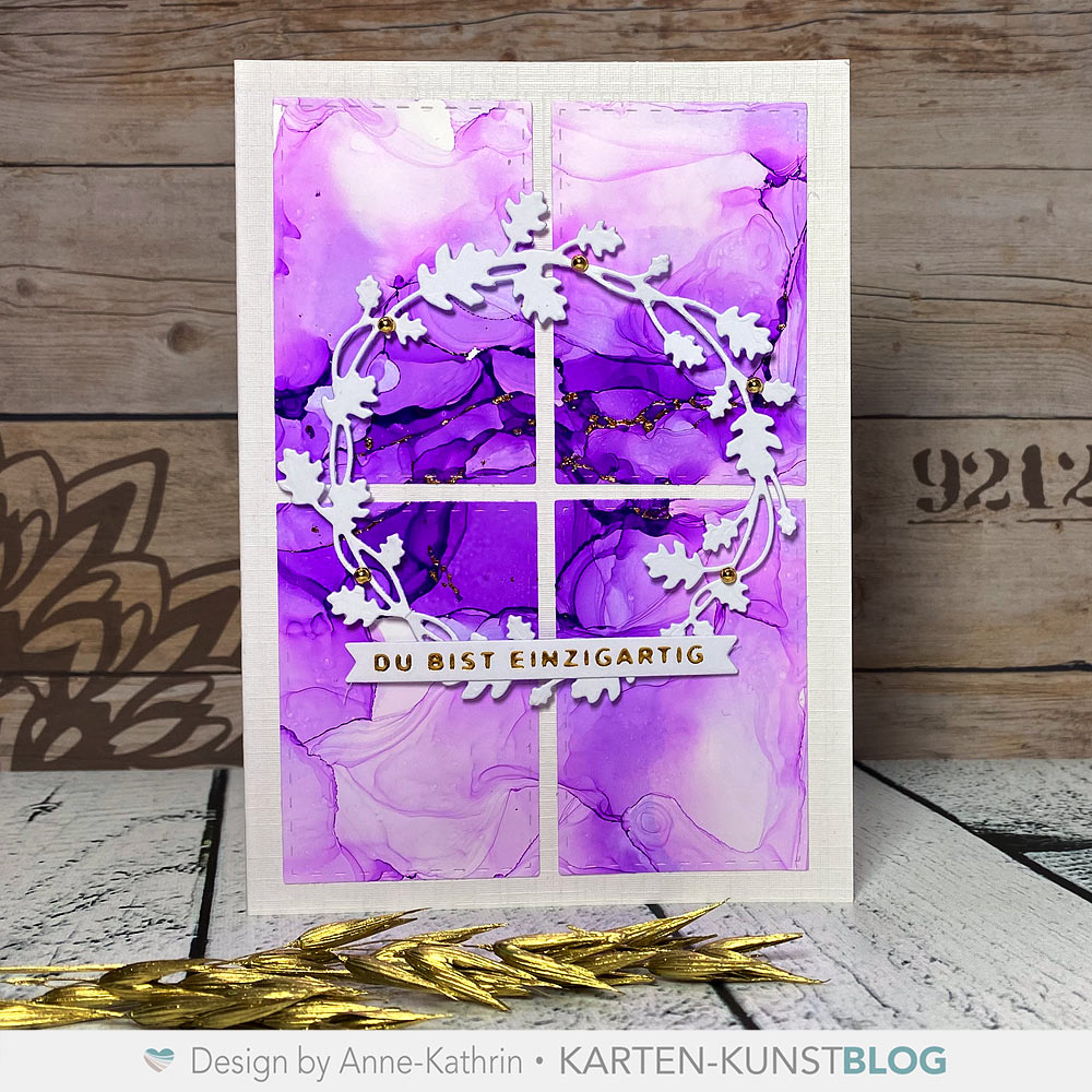 Ich liebe es, mit Alcohol Inks zu experimentieren – die intensiven Farben und die fließenden Muster machen einfach Spaß. Bei dieser Karte habe ich den Hintergrund in sattem Lila gestaltet und mit goldenen Akzenten versehen. Die Unterteilung soll an ein Fenster erinnern und gibt dem Ganzen eine schöne Struktur. Ein filigraner Blätterkranz und ein goldgeprägter Spruch runden das Ganze ab.