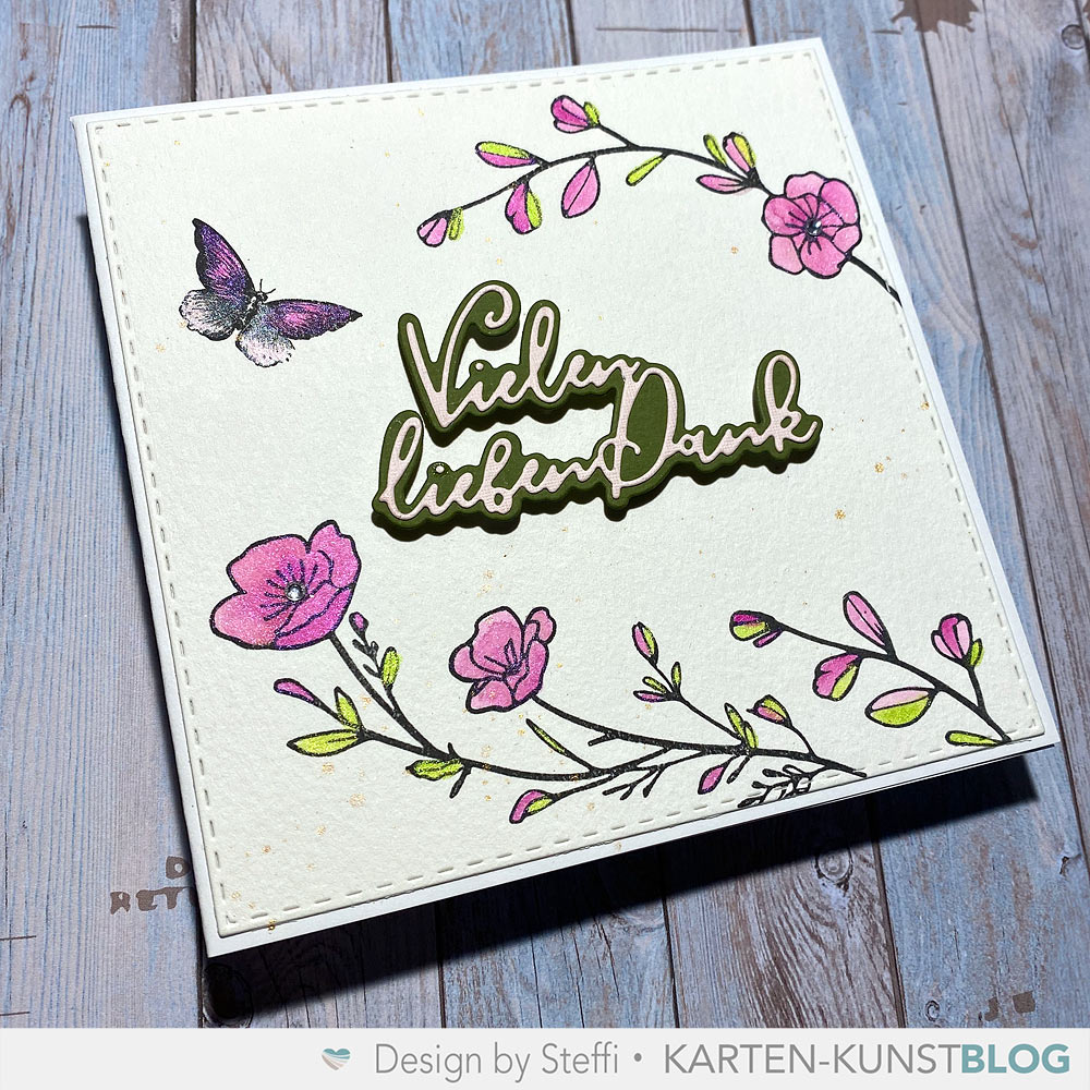 Diese Karte bringt den Frühling direkt aufs Papier! Die zarten Zweige und Blüten aus dem Set Delicate Plants bilden eine florale Umrahmung für den ausgestanzten Schriftzug „Vielen lieben Dank“.