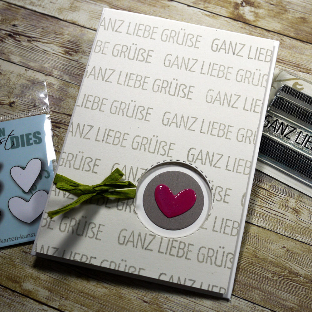 Im Beispiel wurde der Hintergrund mit einem wiederholten Textstempel gestaltet und das Herz in der Kreismitte als farbiger Akzent hervorgehoben – ergänzt durch eine kleine Schleife aus Papierband.
