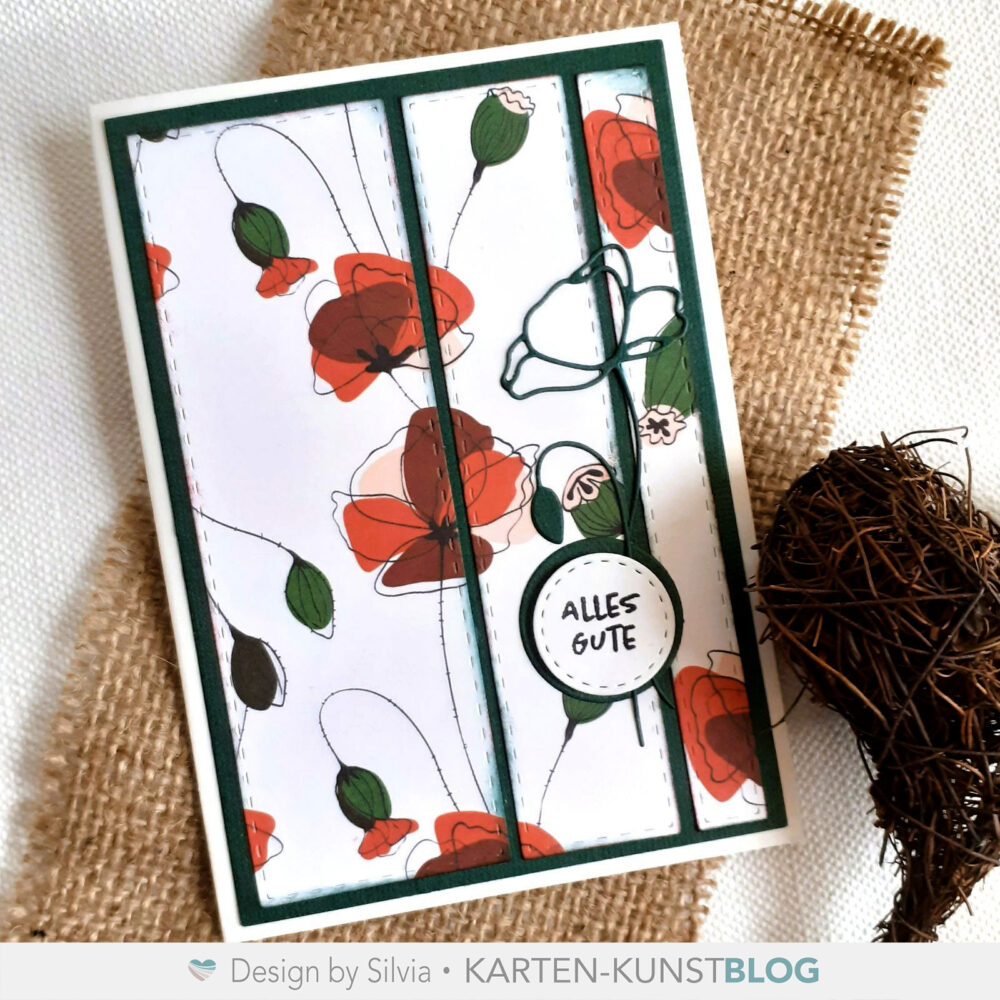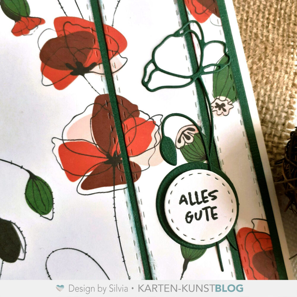 Mit dem großen Element habe ich den grünen Kartenaufleger gestanzt und dann ein Stück Mohnblumenpapier mit den drei kleineren. Alle Kanten wurden leicht geinkt und dann alles auf dem Aufleger arrangiert.