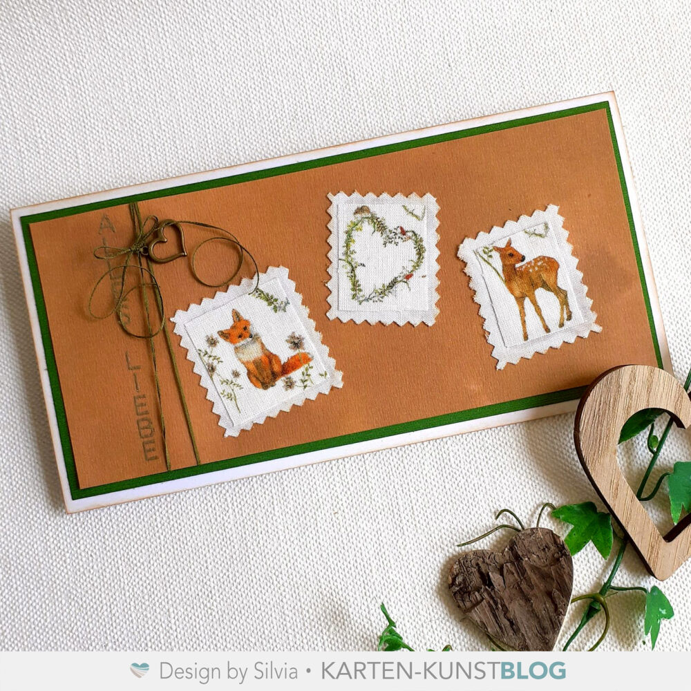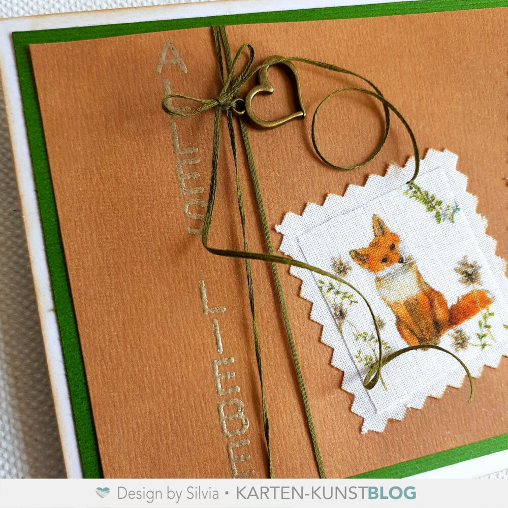 Auch die #kkskzizze036 habe ich gedreht und dann drei Stoff-Briefmarken aus meinem Fundus aufgeklebt und dazu ALLES LIEBE aus dem Stempelset KK-0242 âVertikale Worte III Viele GrĂŒĂeâ in Super fine Platinum embossed.