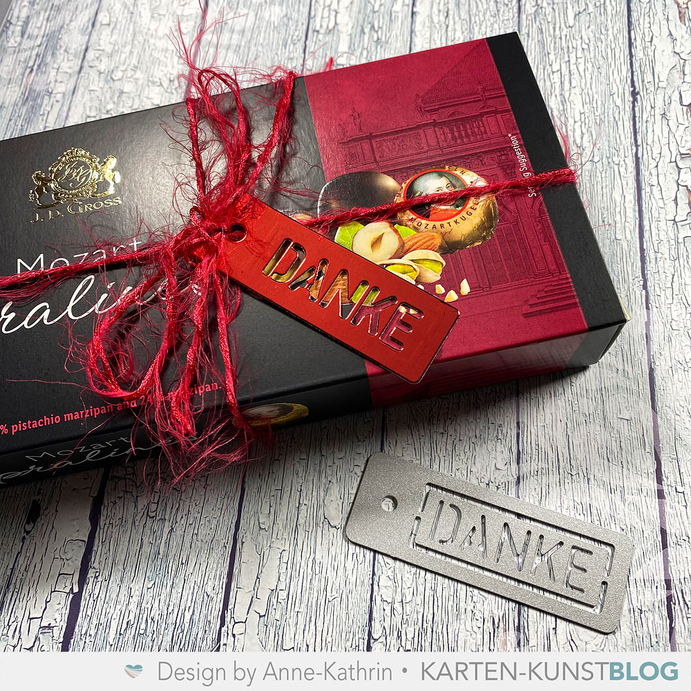 Ein kleines Dankeschön für eine Theater-Kollegin, die unser Stück mit ganz viel Accessoires aus dem privaten Fundus versorgt hat. Das Danke-Anhängerchen ist einfach aus rotem Spiegelkarton gestanzt und mit etwas Effekt-Wolle um die Pralinen gewickelt. Dauert nur eine Minute und sieht in Verbindung mit der rot-schwarzen Pralinenschachtel dramatisch-edel aus 😄