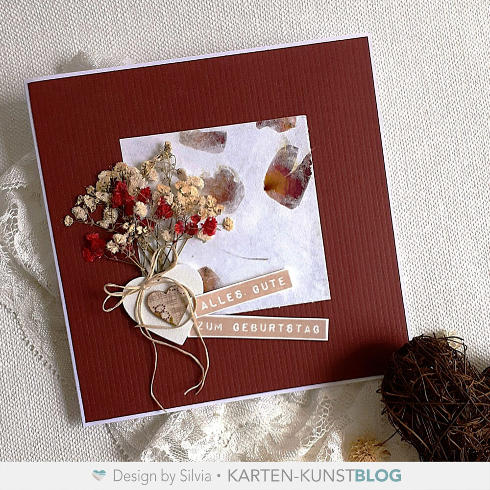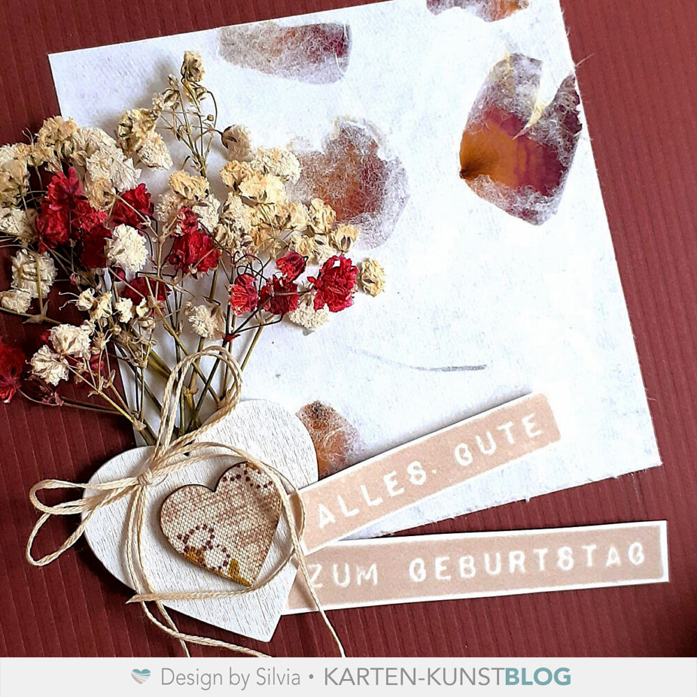 FĂŒr meine heutige Umsetzung habe ich mir edles Papier, teilweise mit getrockneten BlĂŒten drin, geschnappt und dazu Trockenblumen und ein kleines Holz-Herz arrangiert. ZweiStempelsprĂŒche aus dem Karten-Kunst Stempelset KK-0130 âLabelwriter zum Geburtstagâ machen die Karte und Skizze perfekt. đ„°