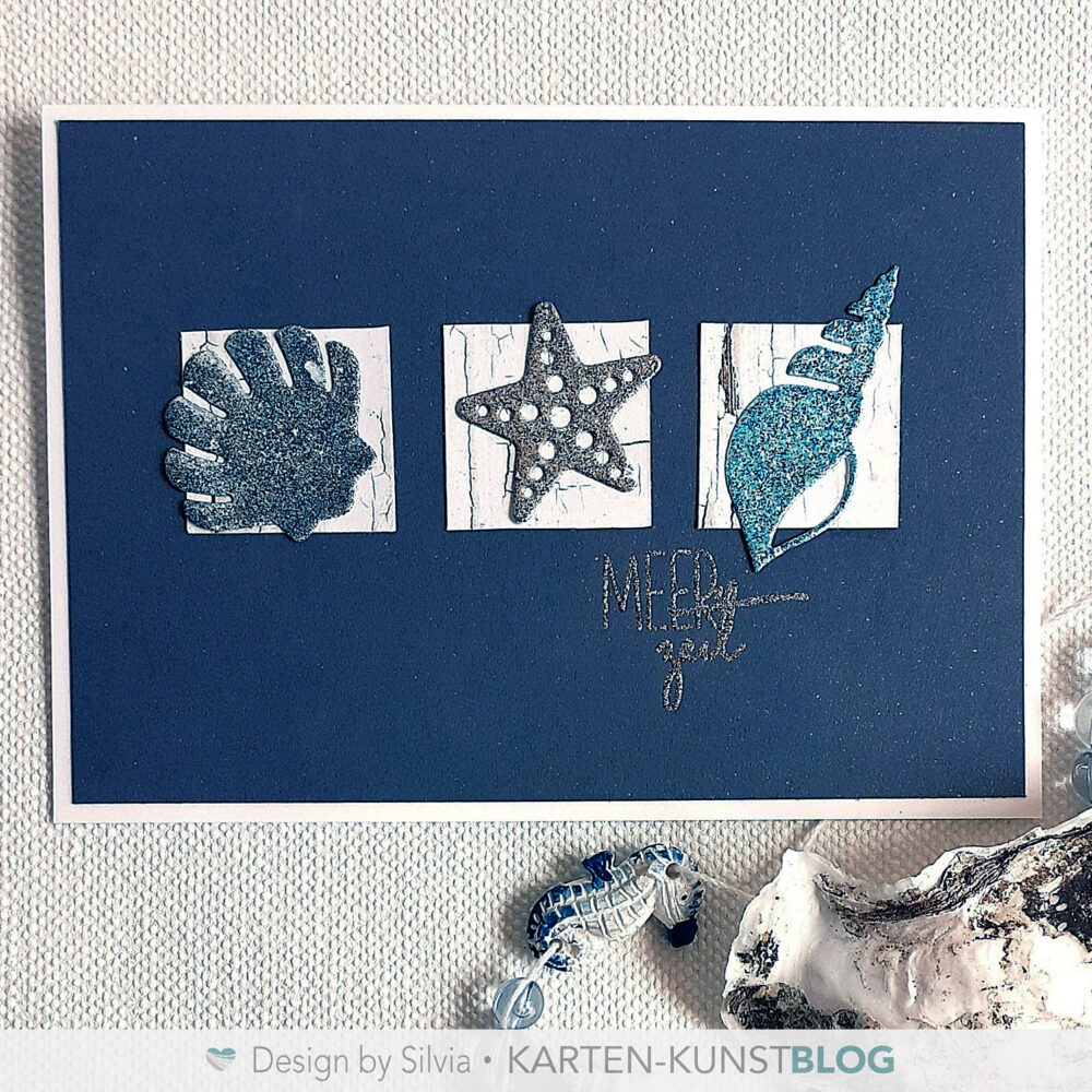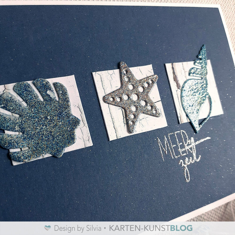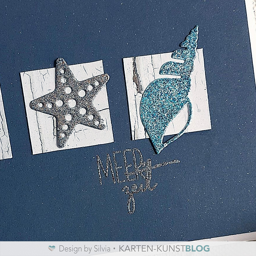 DafĂŒr habe ich die Stanzformen aus dem Set KK-D046 âAt the seaâ erst gestanzt, dann ins Embossing-Stempelkissen gedrĂŒckt und danach mit einer selbst kreierten Embossingpulver-Mischung bestreut und embossed. Das Ganze gleich zweimal, damit es schön krĂ€ftig wird. đ€