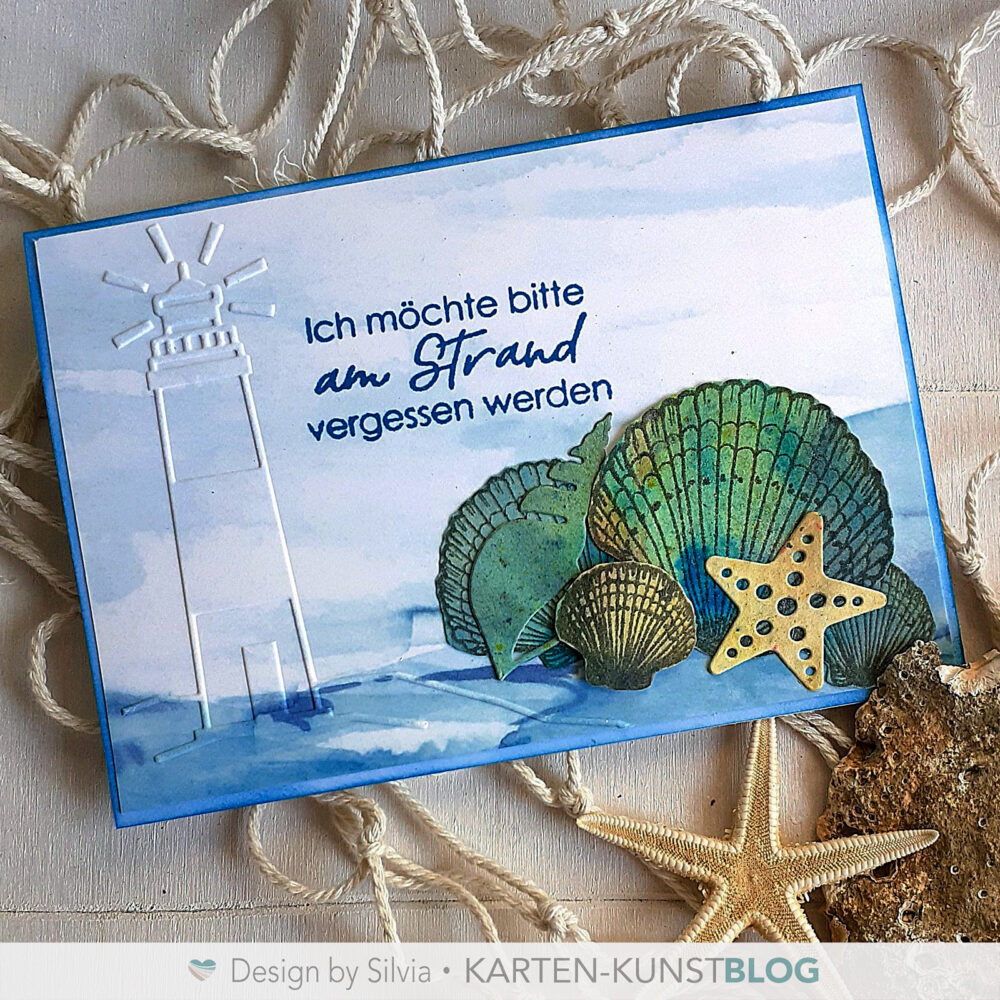 Meine Basis-Karte habe ich rundherum gewischt und den Aufleger aus Designpapier mit einem ganz alten Darice Prägefolder aus meinem Fundus geprägt und den Spruch aus dem Stempelset KK-0217 „Muscheln Stempel maritim“ vom @kartenkunstshop daraufgesetzt.