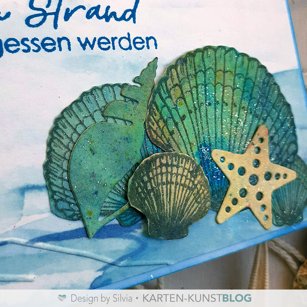 Die Muscheln aus diesem Set habe ich auf Aquarellpapier gestempelt und von Hand ausgeschnitten. Das Papier habe ich vorher wieder einmal hingebungsvoll mit Magicals & Co. gestaltet. Aus dem gleichen Papier habe ich mit den Stanzformen Set KK-D046 „At the sea“ noch eine andere Muschel und einen Seestern gestanzt und alle zusammen arrangiert. 🤗