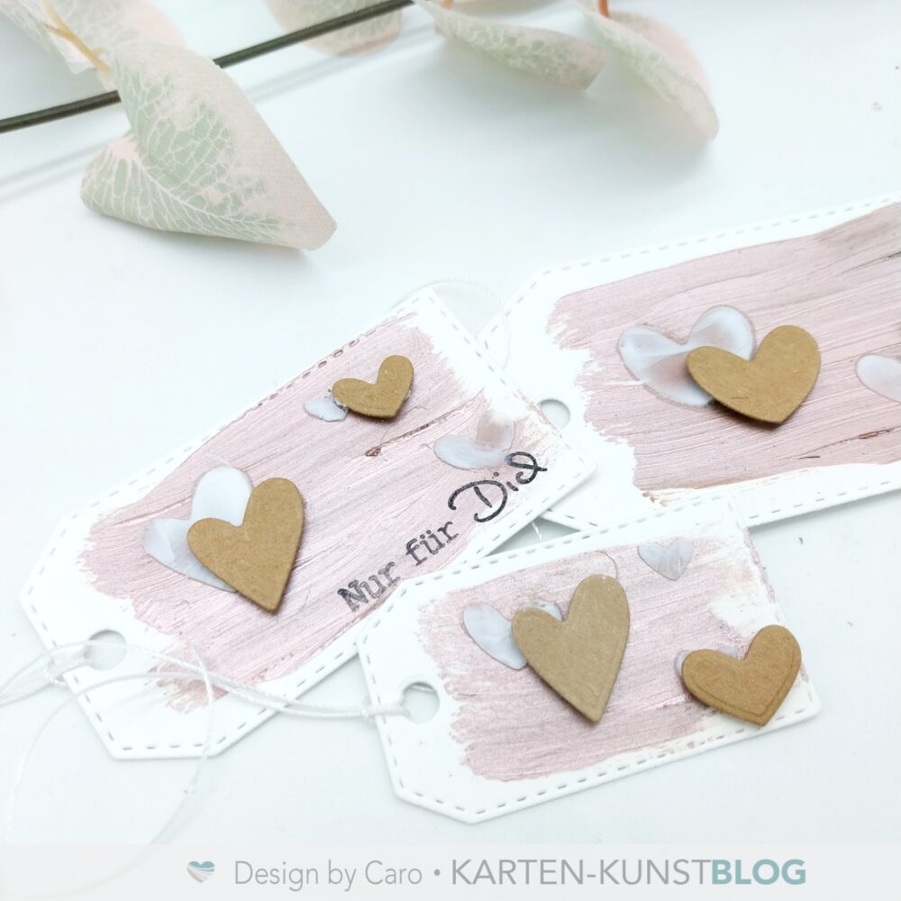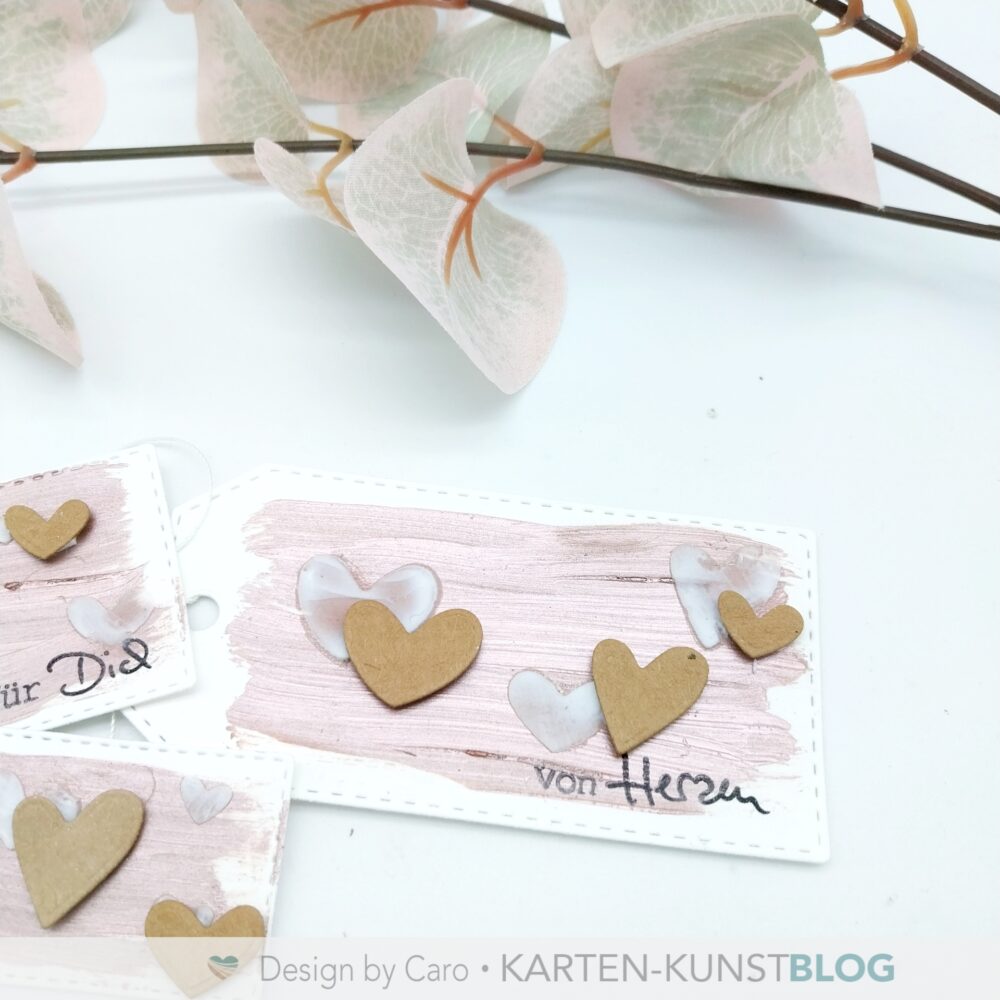 Dazu habe ich auf die ausgestanzten Anhänger mit einer Metallic Farbe den Hintergrund vorbereitet und dann habe ich die Herzen aus Kraftpapier ausgestanzt. Das Negativ der Herzen habe ich als Stencil genutzt und mit einer feinen Fluffy-Strukturpaste den Hintergrund verziert. Dann habe ich die Sprüche gestempelt und die Herzen mit Abstandsklebepads aufgeklebt.