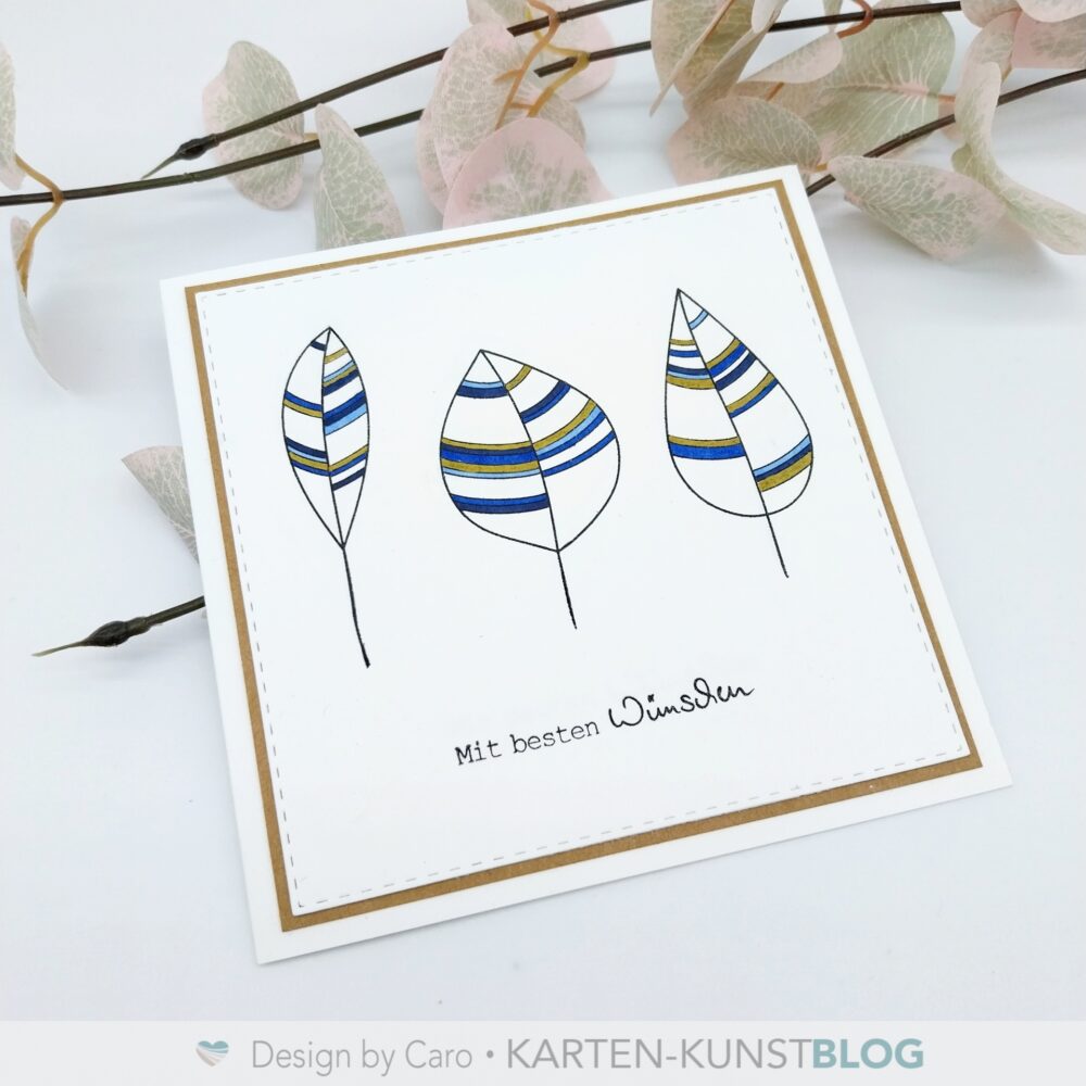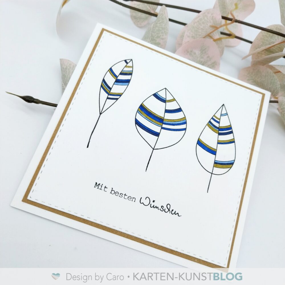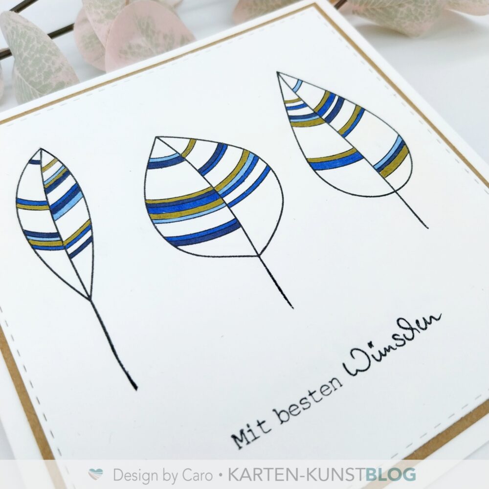 Ich habe dazu auf den ausgestanzten Aufleger die Blätter gestempelt, mit Alkoholmakern coloriert und ein kleines, feines Detail ist das Metallic-Gold zwischen dem Blau, dies habe ich mit einem feinen Stift aufgetragen.