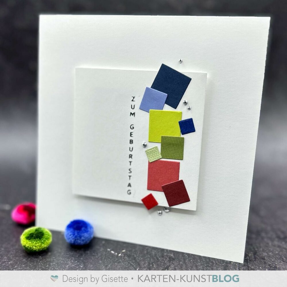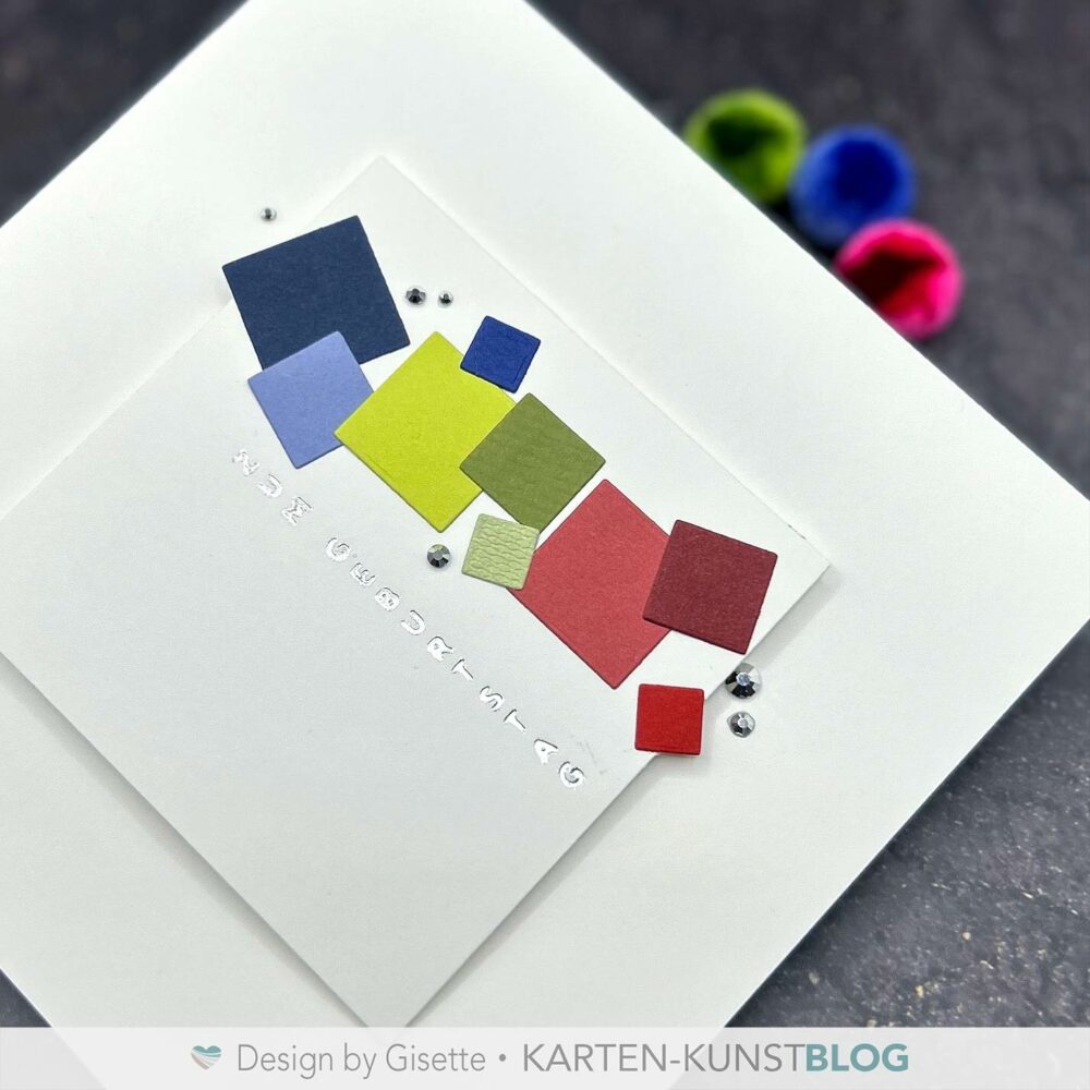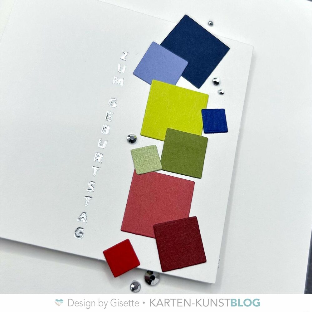 Meine Umsetzung habe ich gestaltet mit den Stanzen „kk-D210 Squares“ und einem Text aus dem Hotfoil Set „Mini Worte vertikal“
