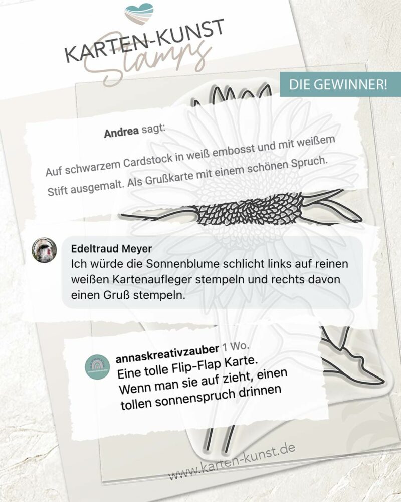 Bitte schickt mir eure Postadresse per Direktnachricht oder Mail, damit sich der Sonnenblumen-Stempel ganz bald auf den Weg zu euch machen kann! Ich bin gespannt, wie eure Ideen in die Tat umgesetzt aussehen đ