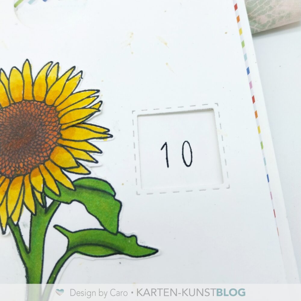 Ich habe dazu eine Drehscheibe ausgestanzt und in der Mitte eine Markierung gesetzt. Dann habe ich den Aufleger gebastelt, indem ich oben einen Halbkreis ausgestanzt habe und an der Seite ein Sichtfenster fĂŒr die Zahlen. Im Anschluss habe ich auch auf dem Aufleger die Mitte markiert und durch beide ein Loch gemacht. Ăbereinander legen und dann die Zahlen in das Feld Stempeln und dazwischen weiterdrehen. Bei mir passten so 13 Zahlen auf die Scheibe. Die GröĂe der Stempel aus dem @kartenkunstshop ist perfekt dafĂŒr. Nicht zu groĂ, aber auch nicht so klein, dass man nichts erkennen kann.