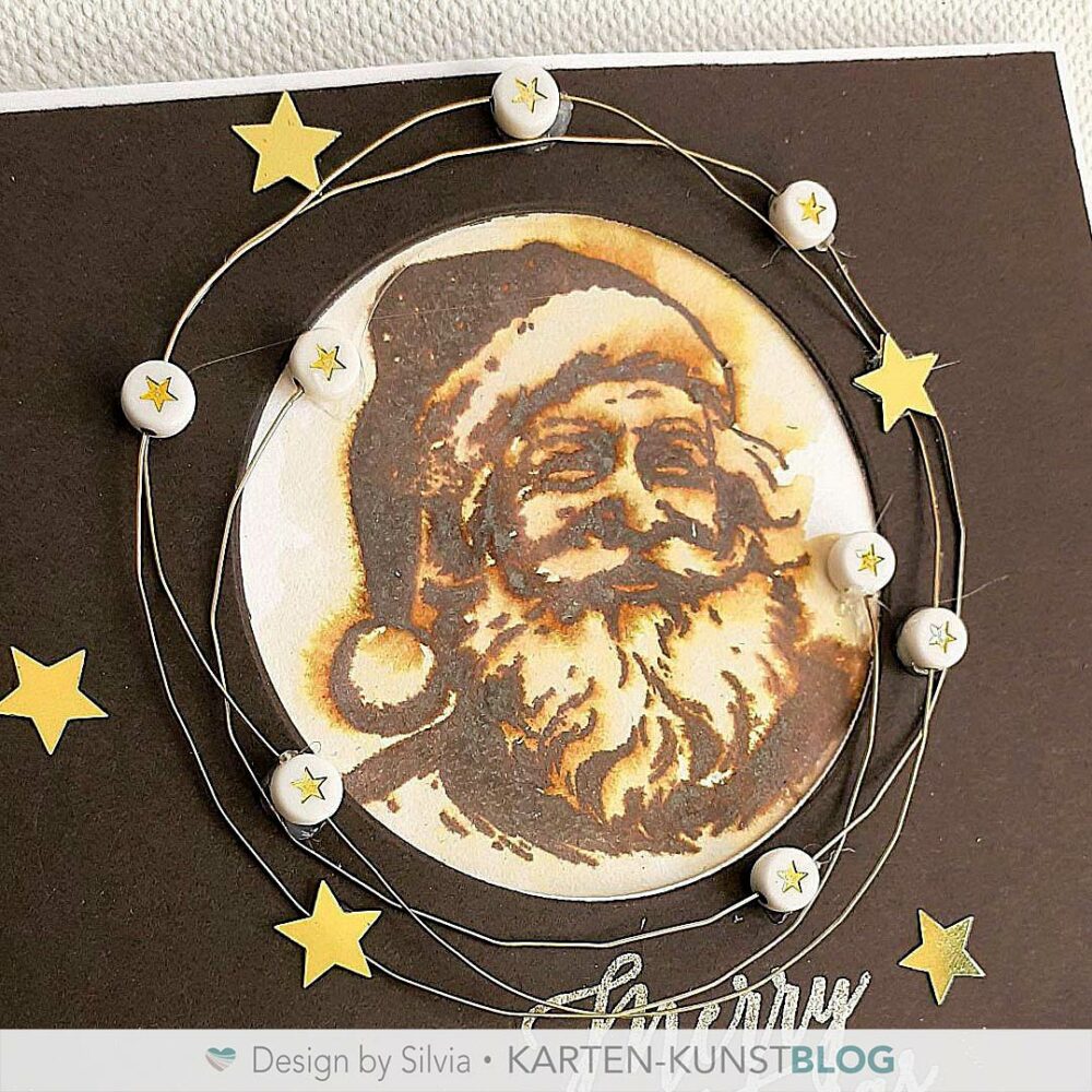 Wie Santa mit zwei Distress Oxides Stempelkissen (bei mir waren es „Tea Dye“ und „Walnut Stain“) schnell „koloriert“ wird, zeigt euch Anne-Kathrin vom Karten-Kunst Shop ganz genau auf ihrem YouTube Kanal, den ihr ja sicher kennt und abonniert habt 😉