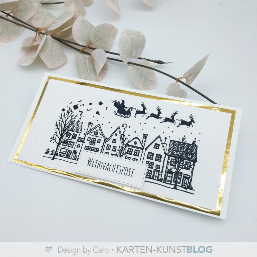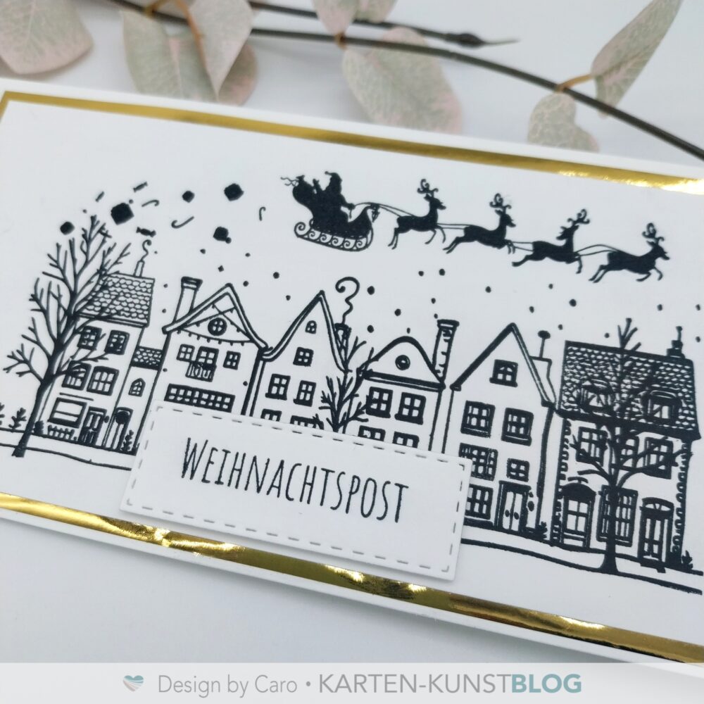 Ich wollte eine Karte mit dem tollen fliegenden Schlittenstempel vom @kartenkunstshop basteln. Als dann aber noch der Häuserreihenstempel auf meinem Tisch lag, musste ich beide miteinander kombinieren 😍.