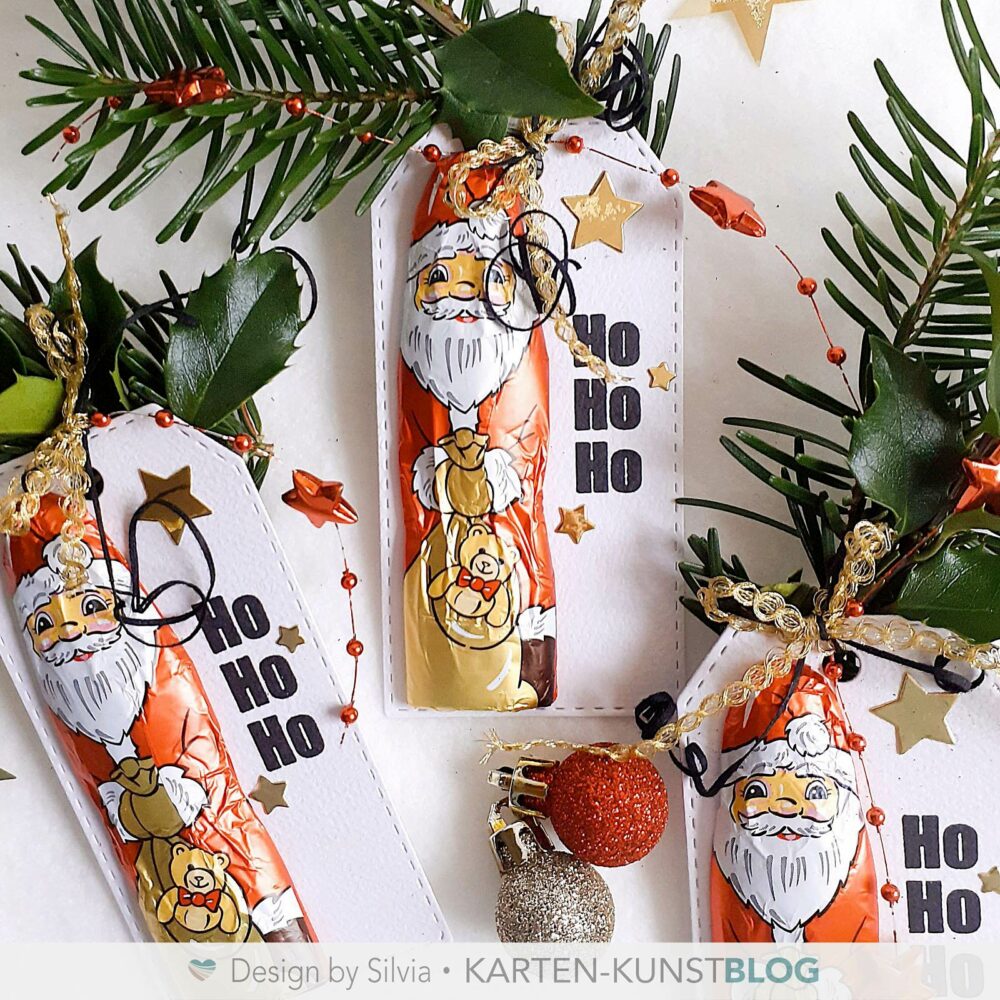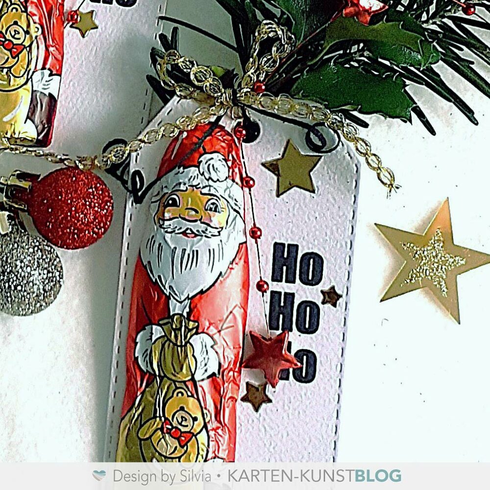 Dafür habe ich einen Schokoweihnachtsmann auf den größten der Anhänger kk-D066 „Tags With Stitches“ vom @kartenkunstshop geklebt und dazu das HoHoHo aus dem Stempelset KK-0092 „Typomix Weihnachten“.