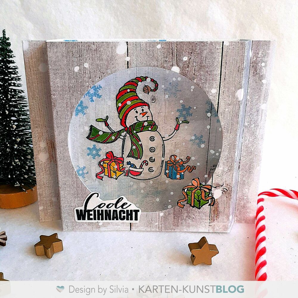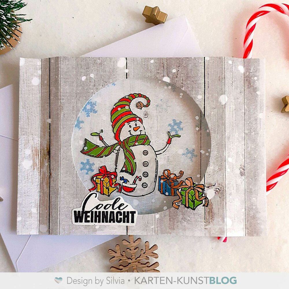 Ich habe den Schneemann aus dem Stempelset KK-0121 âBraver Schneemannâ vom @kartenkunstschop mit seinen Geschenken hinter eine Schneeflockenfolie gesetzt âïž.