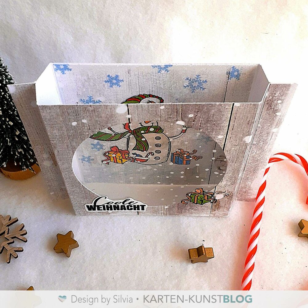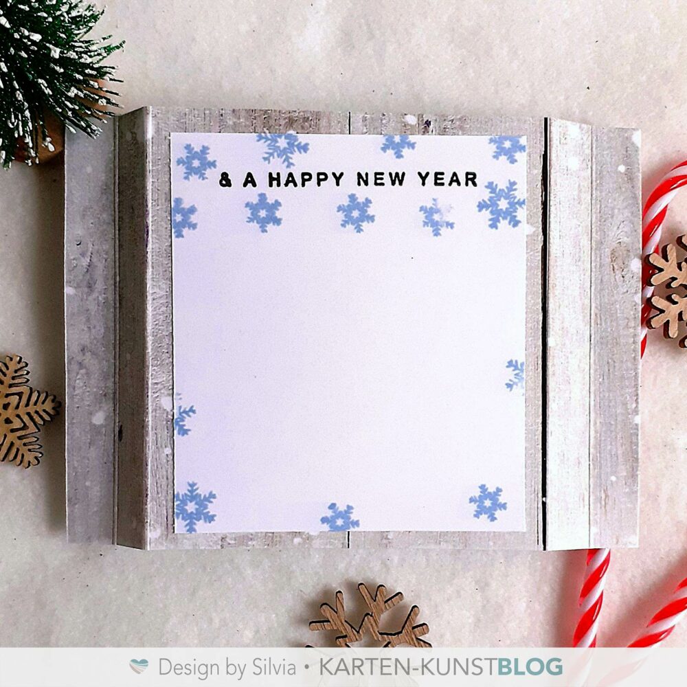 Dazu die Schneeflocken und einen Spruch aus dem tollen Stempelset KK-0092 âTypomix Weihnachtenâ vorn, sowie dem Set KK-0201 âWeihnachten modernâ fĂŒr hinten auf dem Textfeld.