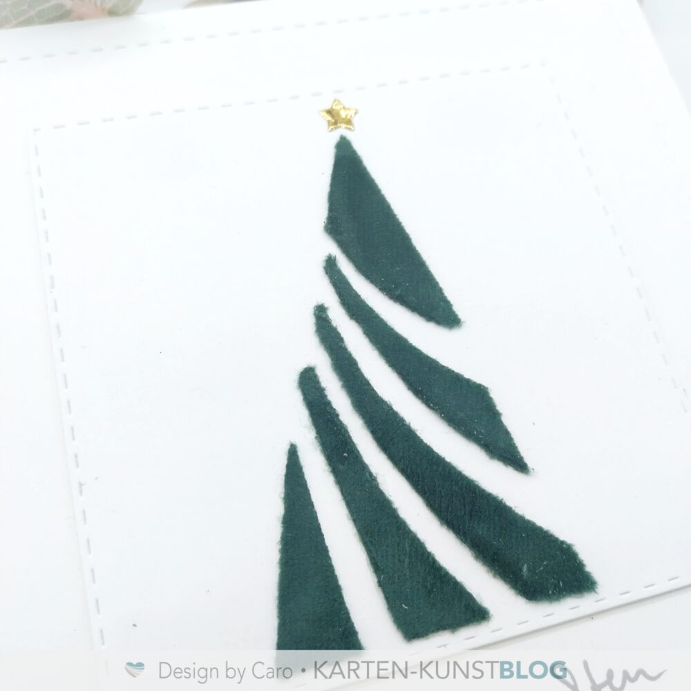 Ich habe den Samtstoff zuerst auf Cardstock geklebt und dann mehrfach durch die Stanzmaschine gekurbelt. Da so eine normale Stanze nicht komplett durch diese Dicke stanzt, habe ich mit einem Cutter Messer den Baum dann entlang der gestanzten Linien ausgeschnitten.