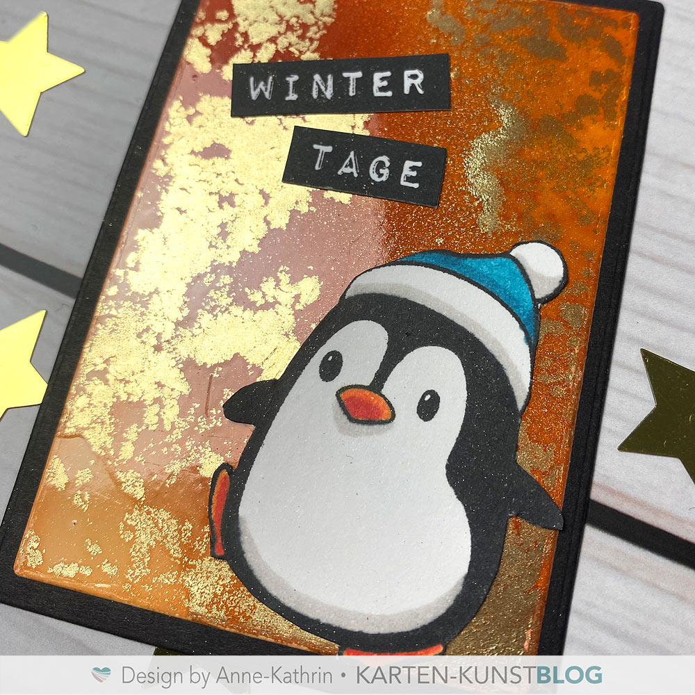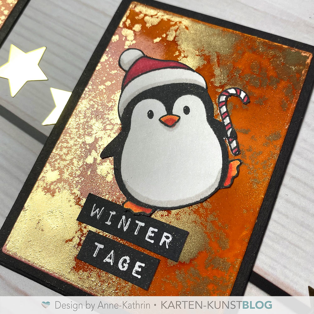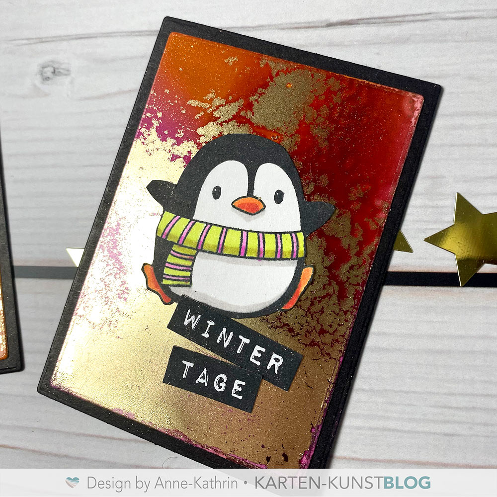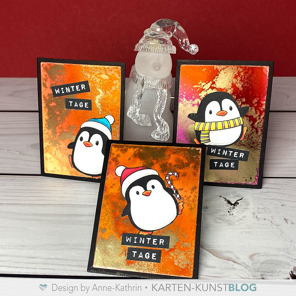 Gestanzt habe ich die Karten mit der Karten-Kunst Stanzschablone kk-D226 ATC Designer, Basis aus schwarzem Cardstock und den Aufleger aus dem Alcohol Ink Hintergrund. Die Pinguine sind mit Spectrum Noir Markern coloriert und per Hand ausgeschnitten. Der Text ist mit dem Labelwriter-Set in Schwarz gestempelt und ausgeschnitten, so kommt der Kontrast zum Hintergrund gut zur Geltung.