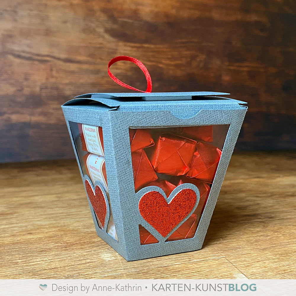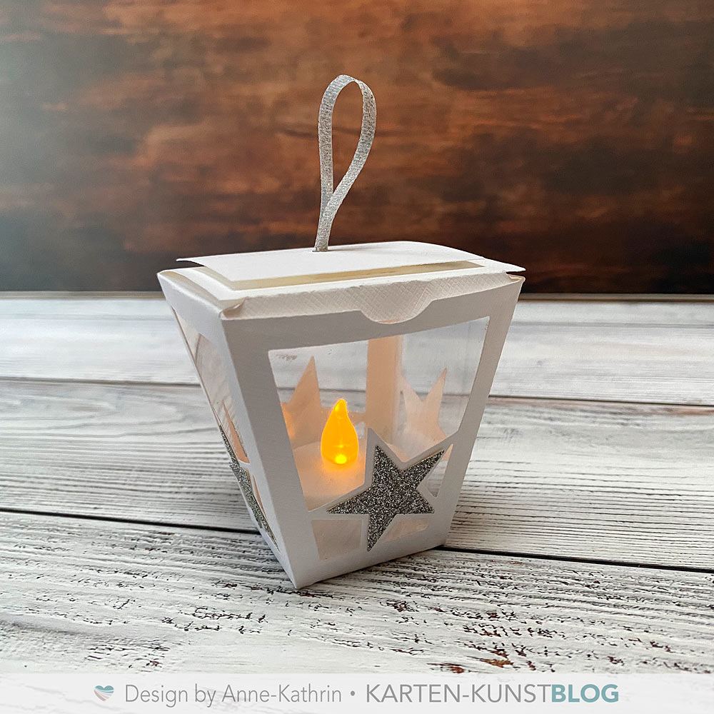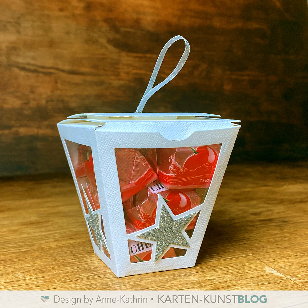 Vor allem wegen ihrer vielen Möglichkeiten: Mit derselben Stanzschablone kann ich eine schlichte Geschenkbox, eine Box mit Fenster oder eine kleine Laterne erstellen, entweder zu Weihnachten, zum Geburtstag oder zur Hochzeit – je nachdem, ob ich sie mit Tanne, Stern oder Herz stanze, oder ganz ohne Motiv. Die Form steht stabil und die Fenster geben optional den Blick nach innen frei. Befüllt mit Süßigkeiten ist sie ein tolles Geschenk oder mit LED-Lichtern eine zauberhafte Deko. Und das Beste ist: trotz der Größe der Box, braucht ihr dazu keine Stanzmaschine in A4, es reicht eine normale Big Shot oder Spellbinders Platinum!