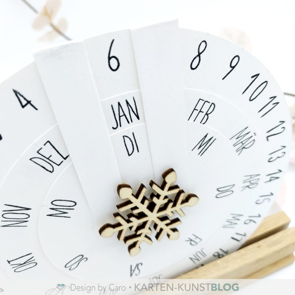 Die Mitte kann klassisch so bleiben oder aber je nach Jahreszeit und Geschmack dekoriert werden. Ich habe einen kleinen Magneten an eine Holzschneeflocke geklebt, da es heute am Basteltag geschneit hat ❄️ und diese hält dann an der Musterbeutelklemme. Durch den Magneten lässt sich die Deko super schnell austauschen.