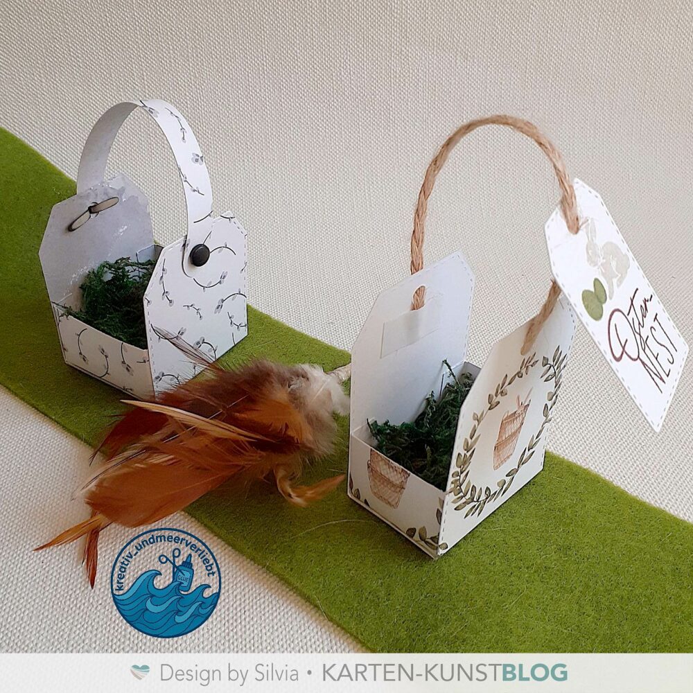 Bei einem Körbchen habe ich mich für einen Henkel aus dem gleichen Papier entschieden und einer ist mit Tüddelband – mir gefallen beide Varianten ganz gut. 🥰